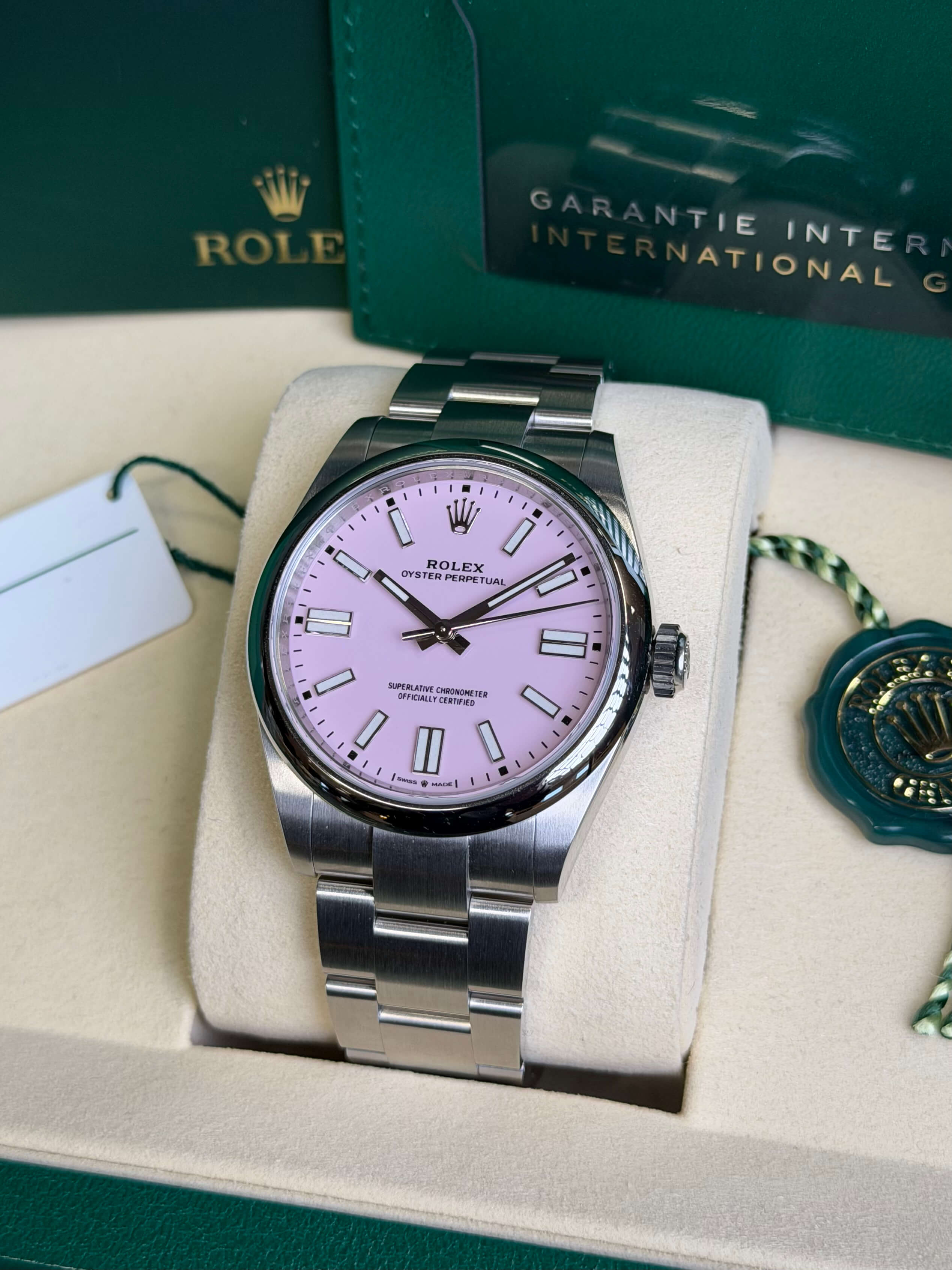 De Rolex Oyster Perpetual 41 ref. 134300 met roze wijzerplaat is een uitgesproken en moderne interpretatie van een tijdloos Rolex-icoon. Dit exemplaar is afkomstig uit 2026, verkeert in volledig ongedragen staat en wordt geleverd als full set.