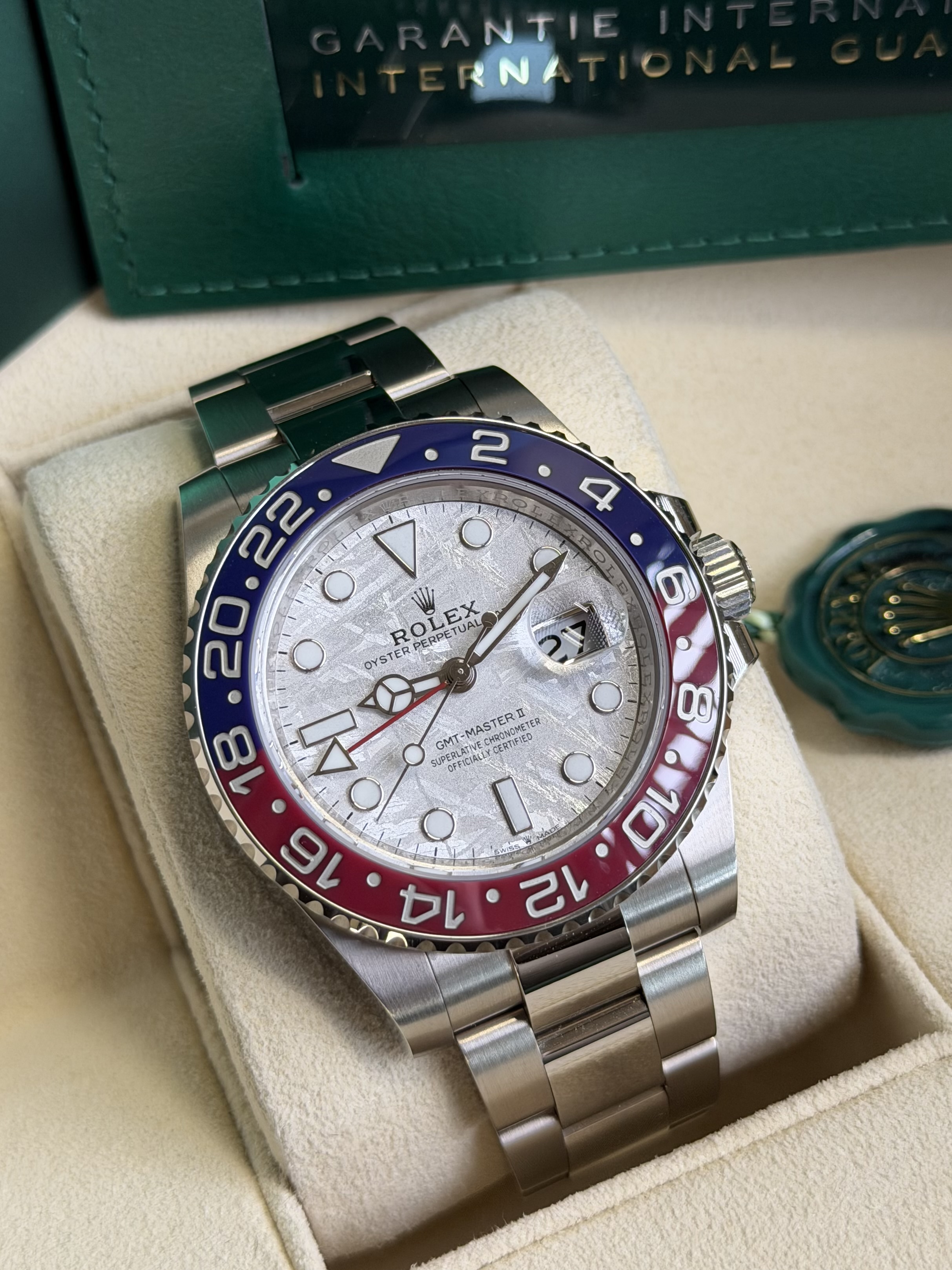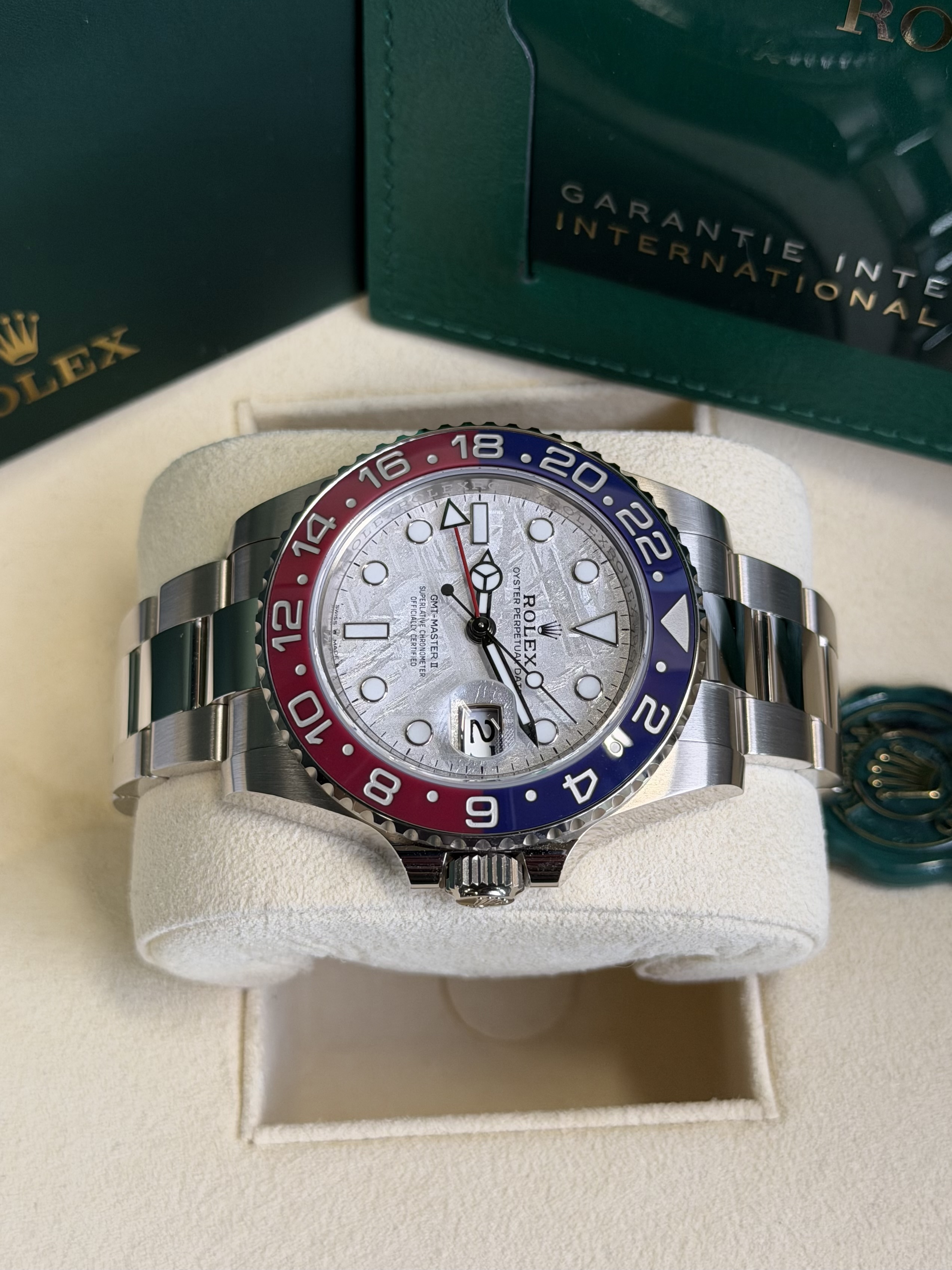 Binnenin tikt het geavanceerde Calibre 3285 met circa 70 uur gangreserve, uitstekende precisie en een praktische GMT-functie voor een tweede tijdzone. Een uitzonderlijk horloge dat luxe, techniek en kosmische zeldzaamheid samenbrengt en aantrekkelijk is voor de veeleisende verzamelaar.